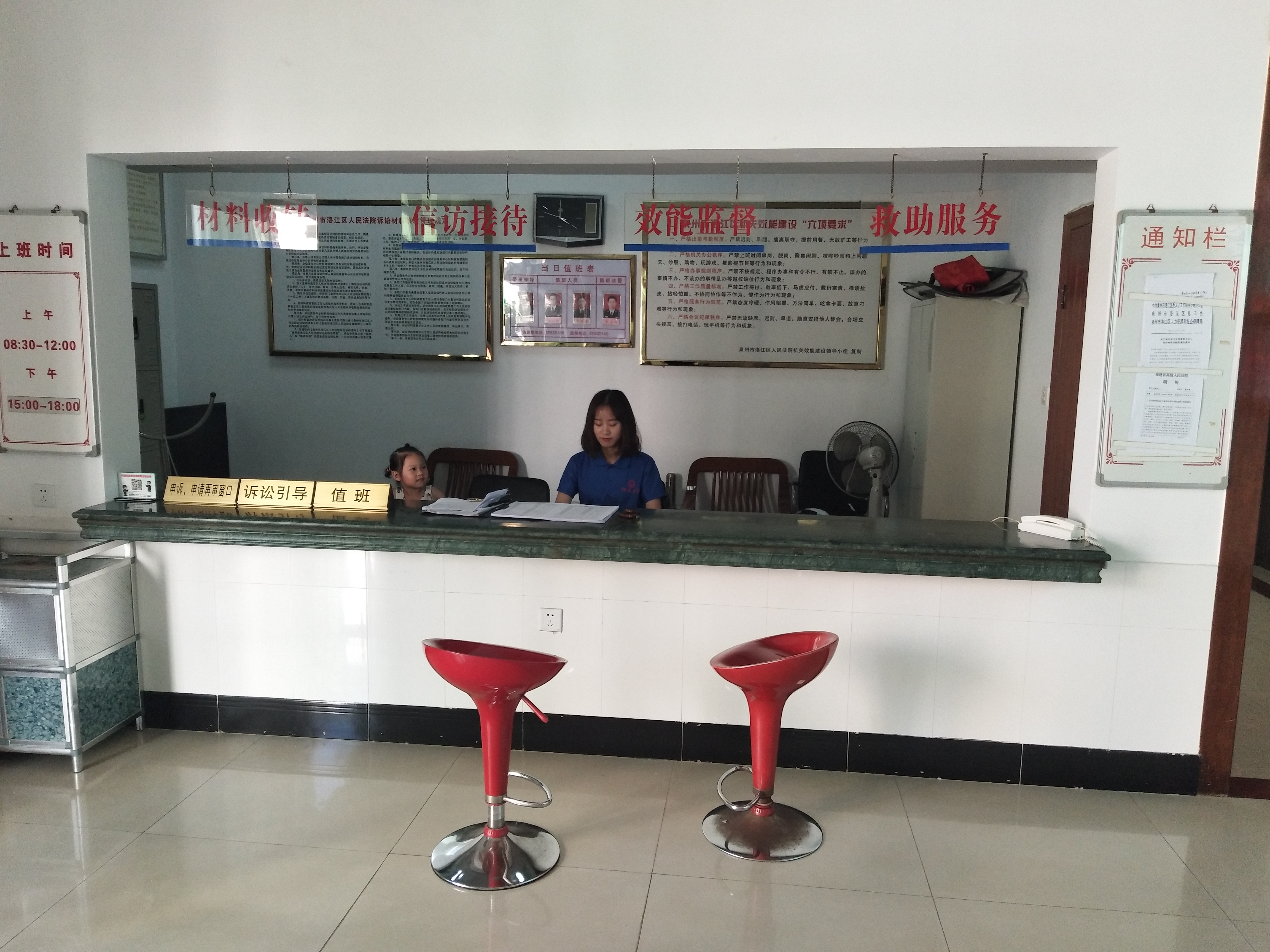 7月20日,实践队员协助法院工作人员在值班室接待来访人员,为来访人员答疑解惑,提供相关服务。