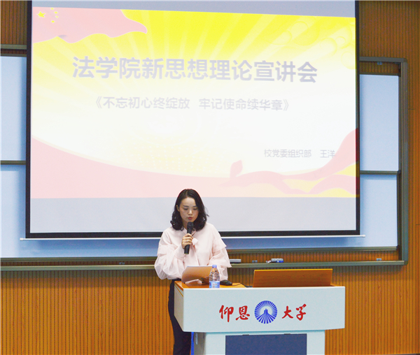 王洋从“历史的新方位”“不忘初心,方得始终”“青年新使命”三个方面诠释了“不忘初心终绽放,牢记使命续华章”的深刻含义,对新时代背景下如何加强高校思政工作进行了理论联系实际的分析。她指出,教师应不忘教育的初心,牢记使命,本着对工作的热爱与责任,以德施教。对于青年,她强调要树立正确的世界观、人生观、价值观。围绕自身学习十九大报告的感悟体会和习近平总书记对青年的谆谆寄语,王洋老师以青年学生感兴趣的方式、接地气的语言,勉励在场学子要不忘初心,努力争做有理想、有本领、有担当的新时代青年,做中华民族伟大复兴的接班人。