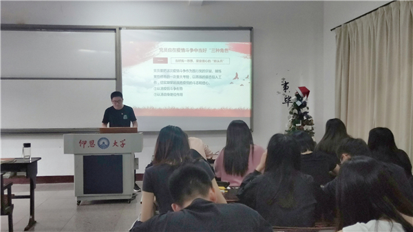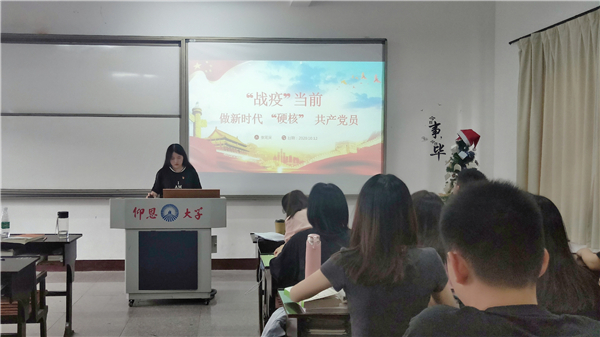 本次专题活动主要以“战疫当前,做新时代‘硬核’共产党员”为主题,强调党员充分先锋模范作用。会上,张笔采、陈茹等同志分别从“战疫一线队党员先锋模范作用的要求”与“党员应在疫情中当好三种角色”方面展开,讲述了党员为了武汉抗击疫情成功,做出的努力和取得的成绩。正是有这样一批最美逆行者在一线付出巨大的努力,为我们筑牢生命堡垒,广大人民群众众志成城、团结一心才有了今天的稳定局面。