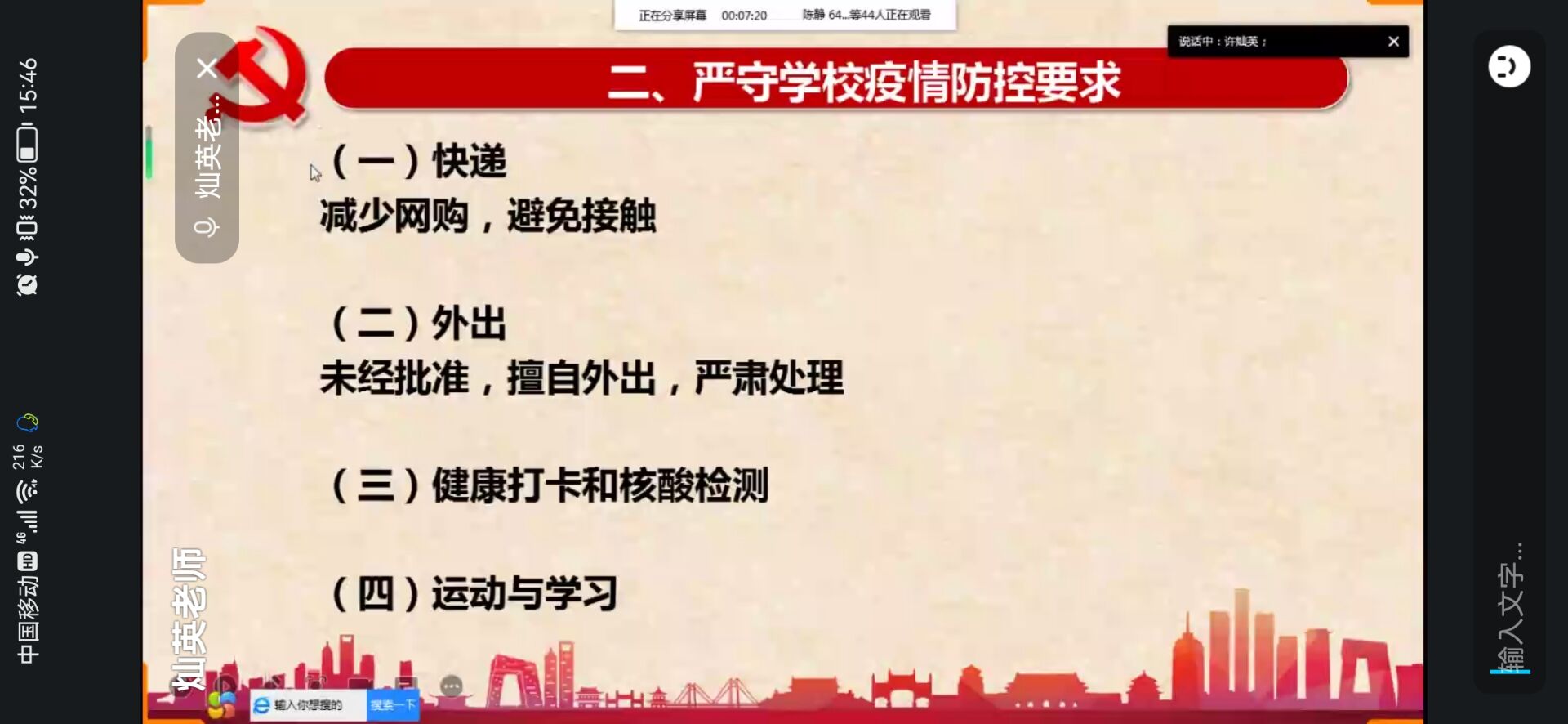 在今年会官方网站党总支书记杨勤的统筹安排下,今年会官方网站11个班级有序开展了安全主题教育线上班会,主要围绕以下方面内容展开:一是关注疫情形势,引导同学们密切关注疫情发展的最新状况,倡导不要放松警惕和麻痹大意,要继续做好防护措施,用自己的实际行动为疫情防控贡献力量。二是强调学校疫情防控管理要求,逐一解读和强调学校发布的各项管理要求,再次向同学们强调务必配合疫情防控管理。三是科普日常防护知识,提示学生要做到不聚集、勤洗手、勤通风、戴口罩、讲卫生,并自觉做好自身健康监测,发现体温异常要及时上报。四是防电信诈骗知识宣传,通过总结分享疫情期间的常见诈骗套路,提示同学在疫情期间更要提高警惕,谨防被骗。五是驻牢心理安全防线,帮助学生更好地接纳自身关于疫情引发的各种负面情绪和压力,引导学生更加全面、正确的认识疫情,有针对性地向学生分享心理自我防护方面的知识和文章,提升学生的自我心理保健能力。