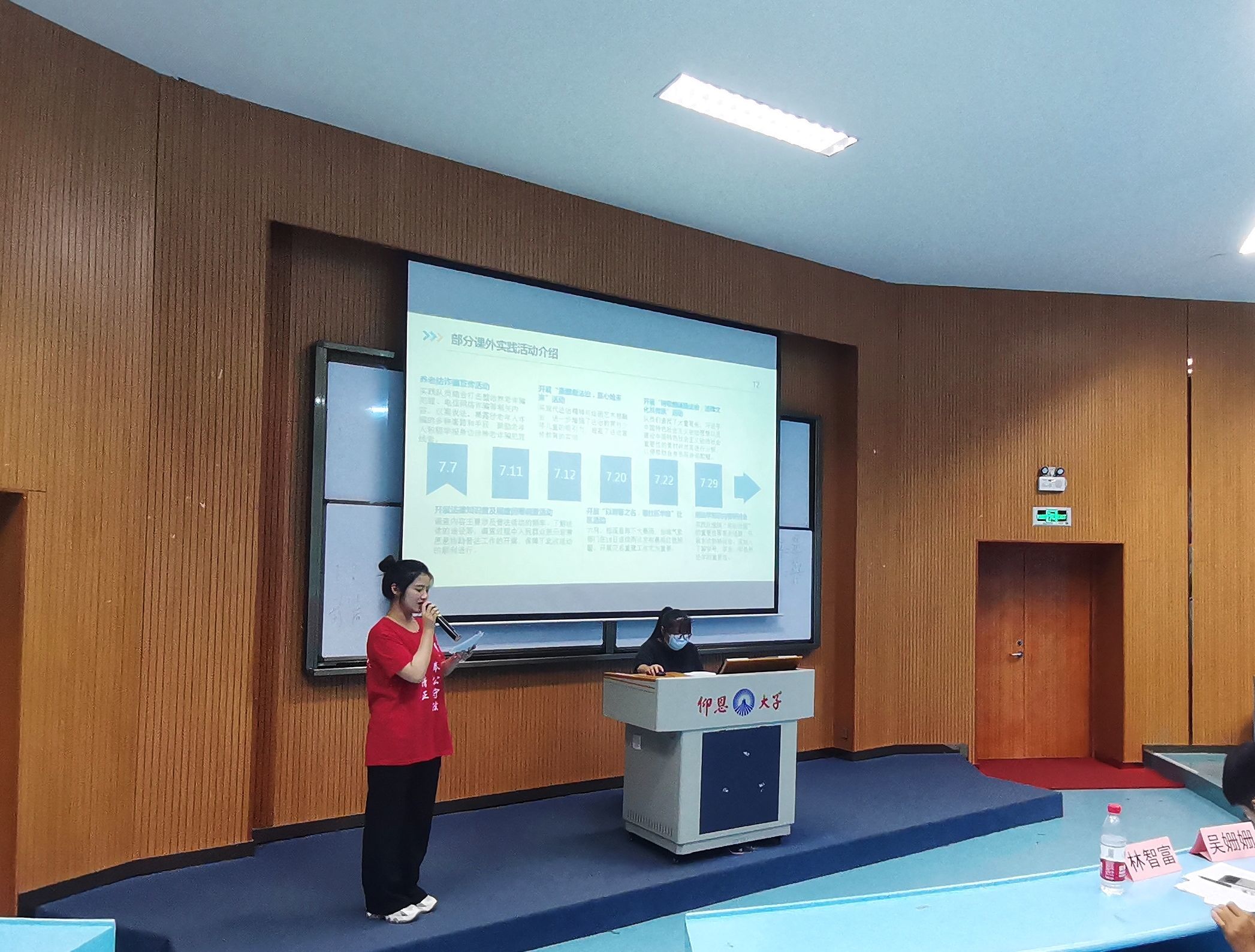 为进一步宣扬二十大精神,加强大学生素质建设。9月23日晚,今年会官方网站于今年会官方网站第三教学区和昌教学楼海纳讲堂开展2021级暑期实践答辩活动。今年会官方网站党总支书记兼副院长杨勤、党总支副书记林媛、今年会官方网站辅导员吴姗姗,林智富、学务秘书汪明、今年会官方网站教师黄文伟到场观看并担任评委。今年会官方网站2021级部分学生参加此次活动。 活动现场,各实践队伍展开激烈的角逐,通过以PPT汇报形式结合现场表演、成果展示等方面来充分展现出实践队暑期实践成果。实践队汇报人分别从实践背景及意义、实践过程、实践特色、实践成果、总结思考等方面讲解各自实践活动,展示出精彩实践经历,分享了团队在实践过程中的收获与感悟。在激烈角逐后,“保护河流生态普法队”荣获第一名,“弘民法沧澜”暑期实践队荣获第二名,“刺桐行:勾画党史画卷”暑期实践队荣获第三名。