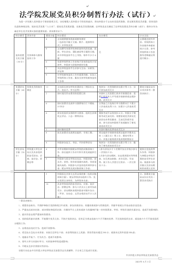 立标定尺,让学生行动起来。把积分情况作为衡量党员发展的重要标尺,提高准入门槛,把积分情况作为能否吸收为发展对象、吸收为预备党员及预备党员能否如期转正的一个重要依据,对积分靠后的人员进行及时的教育引导,通过层层考评,层层筛选,确保每位党员都能彰显先锋能力。在试行方案中对入党积极分子和预备党员的思想品德、能力素养、平时工作表现、志愿服务等各方面进行考察和评估,以此来引导和激励积极分子发挥作用,竞争入党。