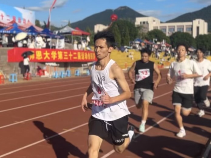 800米作为田径运动的经典项目之一,对于速度,力量和耐力的要求都极为高,极为考验运动员的身体素质与心理素质。烈日炎炎,他奔驰在跑道上,挥洒着汗水,在阳光下熠熠生辉。800米比赛中每一次的挥臂,每一次的迈步都是对耐力,毅力的巨大的较量,他战胜了自己,秉持着超强的毅力,坚持到了最后,超越了一位又一位的参赛选手,在众人激昂的加油声中冲向了终点,最终取得了800米项目第四名的好成绩。