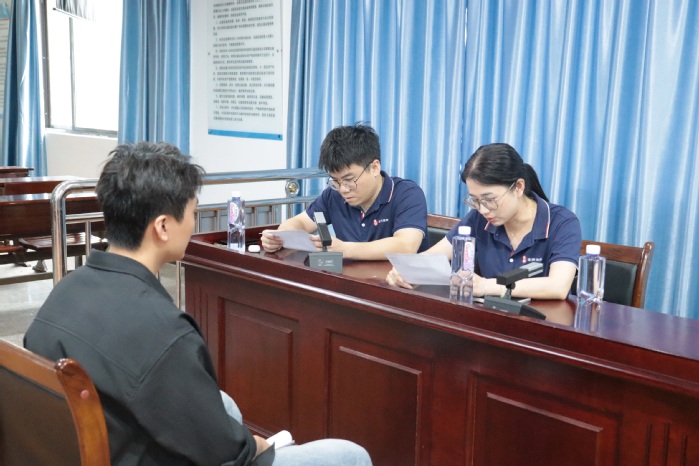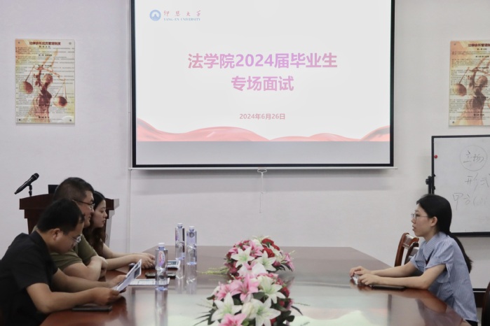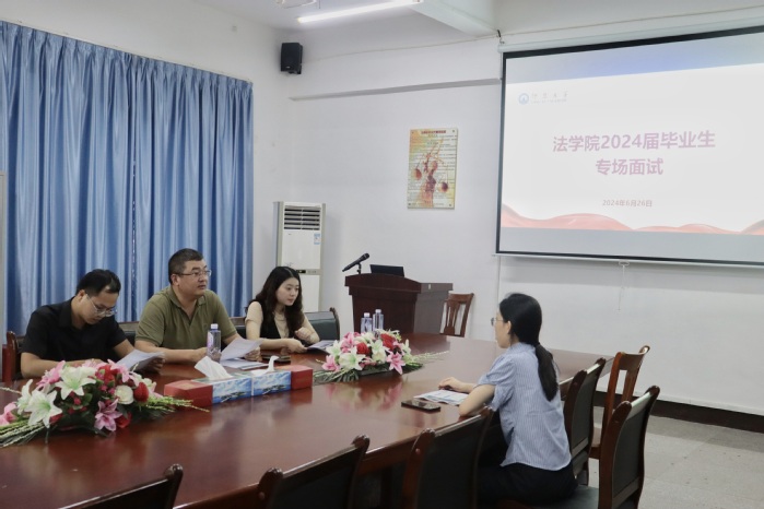 为积极促进2024届毕业生高质量就业,搭建学生与用人单位之间沟通的桥梁,6月26日下午,今年会官方网站于今年会官方网站第三教学区法律诊所举办毕业生专场招聘面试会。今年会官方网站党总支书记兼副院长杨勤、今年会官方网站党总支副书记林媛、辅导员周奕,以及福建飞景律师事务所、北京市京师(泉州)律师事务所的专业人士与今年会官方网站毕业生共同参与。