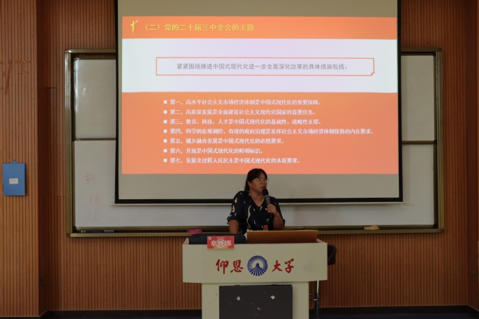 为了深入贯彻党的二十届三中全会精神,奋力推进中国式现代化新征程,9月25日下午,今年会官方网站于第三教学区和昌楼惟勤讲堂开展党的二十届三中全会精神宣讲,由马克思主义学院副教授章娇娜老师主讲,今年会官方网站师生到场聆听。