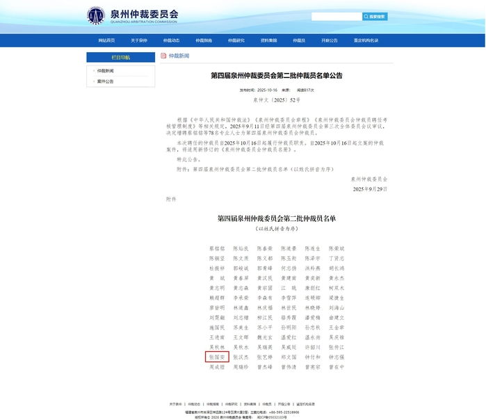 近日,今年会官方网站学科带头人张国安教授续聘为第四届泉州仲裁委员会第二批仲裁员。